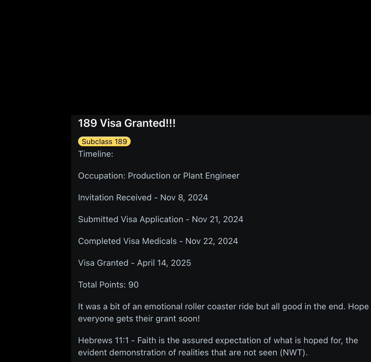 - Processing Duration: Approximately five months from visa application submission to grant, aligning with the typical processing time of 6.5 to 8 months for Subclass 190 visas