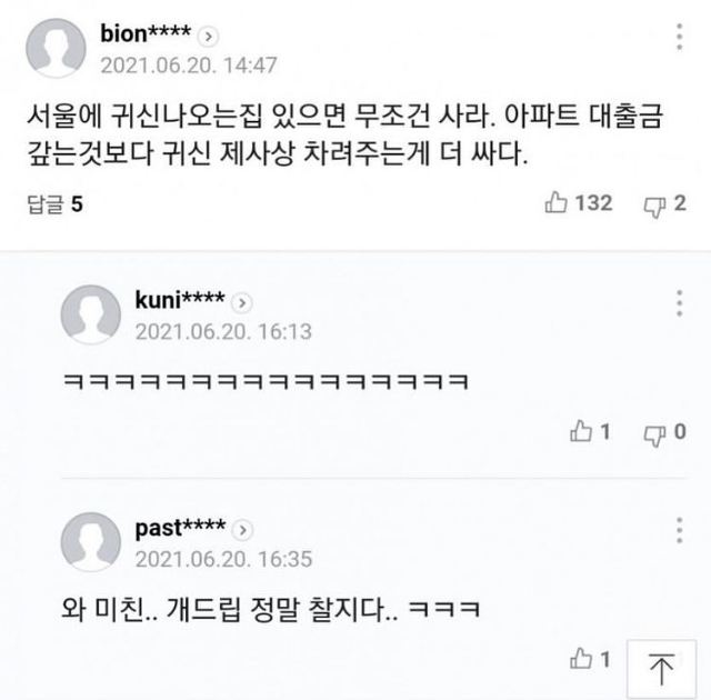 서울 귀신 나오는 집 당장 사야하는 건 부동산 거래의 기본 원칙에 해당됨. 시세보다 저렴하게 사서 (1) 실거주 한다 혹은 (2) 고점에서 판다. 사실상 (2)는 “서울 집값은 오늘이 제일 싸다”라는 팩트에 의하면 팔 일이 없을테고... 저평가된 아파트 매수해서 귀신 제사상 차려주며 실거주 하는게 답.